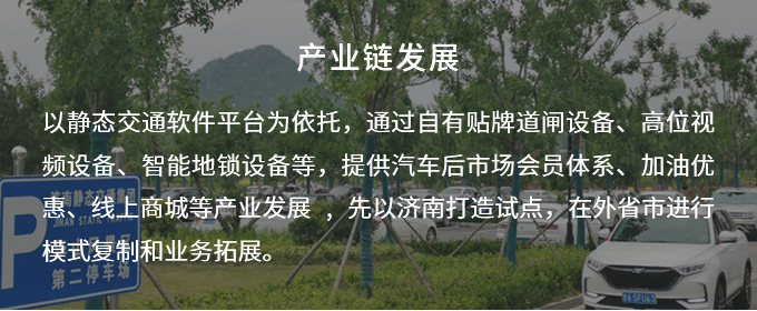 以靜態(tài)交通軟件平臺為依托,通過自有貼牌道閘設備、高位視頻設備、智能地鎖設備等,提供汽車后市場會員體系、加油優(yōu)惠、線上商城等產(chǎn)業(yè)發(fā)展 , 先以濟南 打造試點,在外省市進行模式復制和業(yè)務拓展。